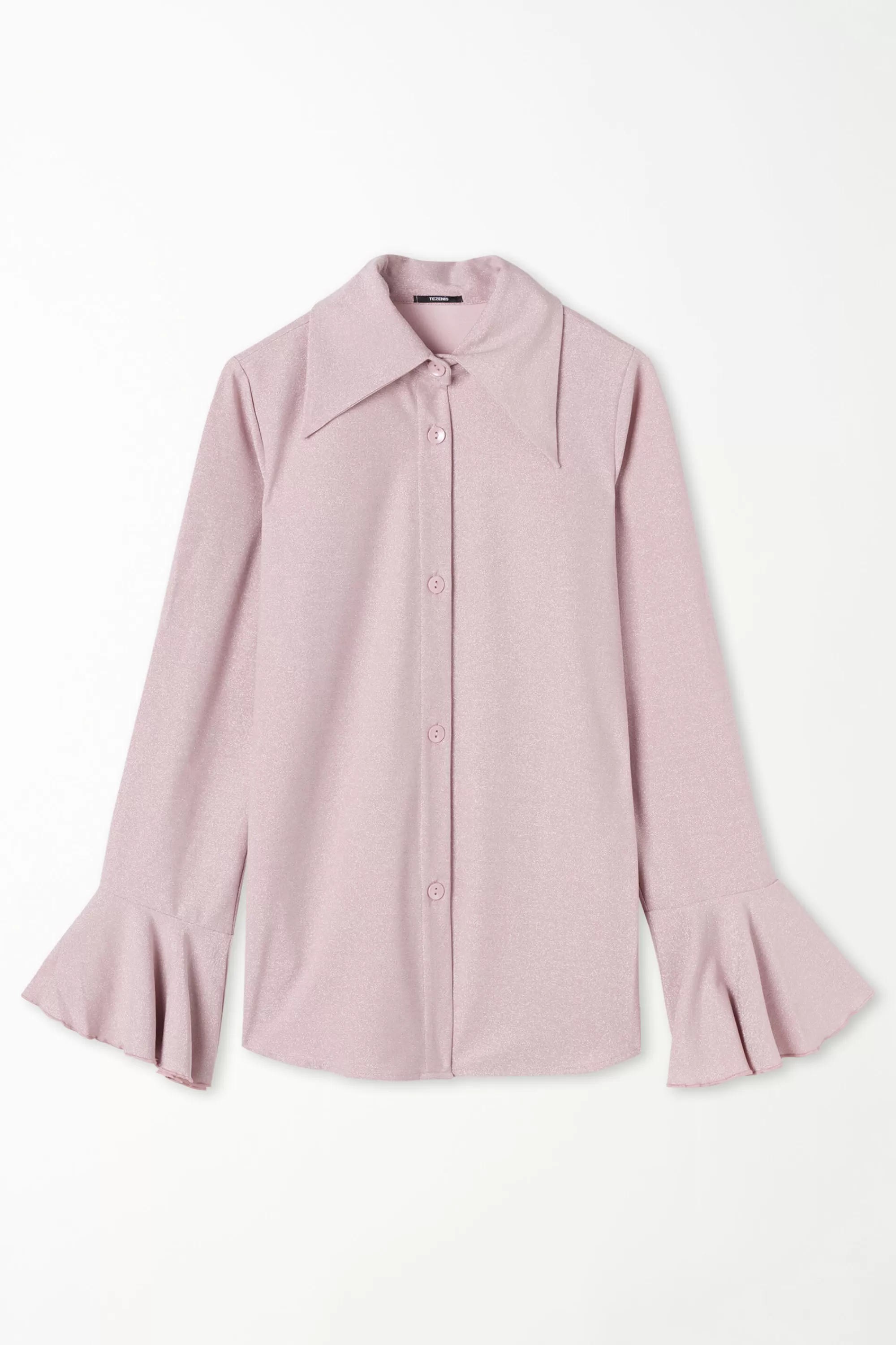 Camicia a manica lunga con bottoni, in tessuto laminato con polsini a campana.|Camicia a manica lunga con bottoni, in tessuto laminato con polsini a campana.